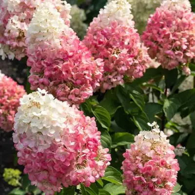 Гортензия метельчатая Пинки Промис (Hydrangea paniculata 'Pinky Promise') — это современный компактный сорт, который идеально подходит для небольших садов, бордюров и групповых посадок. Этот среднерослый кустарник достигает высоты всего 50–100 см при диаметре кроны 80–90 см. Благодаря прочным побегам, куст не разваливается и отлично держит форму даже в период пика цветения. Листва имеет насыщенный темно-зеленый оттенок, который служит прекрасным фоном для нежных соцветий.