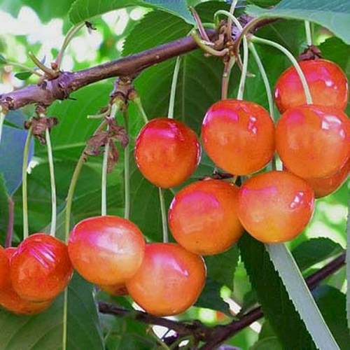 Саженцы черешни "Наслаждение" — это удивительный выбор для садоводов, стремящихся к высокому урожаю и превосходному вкусу плодов. Сорт был выведен в Беларуси при скрещивании черешни Красная плотная и Уголёк. Это универсальное дерево с высокими показателями производительности, что делает его идеальным вариантом для дач и приусадебных участков. Крона имеет пирамидальную форму, приподнятую и средней густоты, что придаёт ей эстетичный вид.Плоды черешни "Наслаждение" отличаются крупными размерами — вес одного плода достигает 6,8 граммов. Форма серцевидная, с основной желтой окраской и оранжевой покровной, что делает их не только вкусными, но и красивыми. Мякоть плодов имеет плотную консистенцию, что придаёт ей особую сочность и сладость, а цвет сока остается бесцветным. Косточка среднего размера хорошо отделяется от мякоти, что делает процесс употребления плодов ещё более приятным. Дегустационная оценка достигла внушительных 4,8 балла.