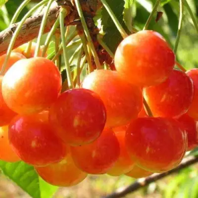 Саженцы черешни Соперница подарят вам крупные, сердцевидные плоды весом около 6,8 граммов. Основная окраска плода желтая, а покровная — красная, что добавляет эстетической привлекательности и делает черешню непохожей на другие сорта. Плотная кожура защищает плоды от повреждений, а сочная мякоть имеет насыщенный желтый цвет и великолепный сладкий вкус с дегустационной оценкой 4,8 балла. Цвет сока прозрачный, а отделяемость косточки от мякоти хорошая.