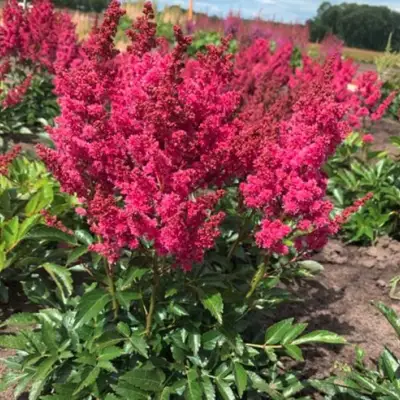 Цветение: Астильба Лаки Дэй радует глаз обилием темно-розовых компактных соцветий, которые делают её незаменимой для создания ярких цветочных композиций.