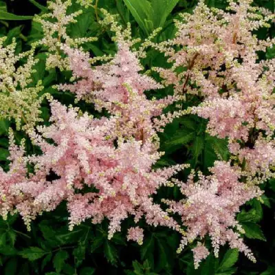 Цветки астильбы «Сестра Тереза» имеют ажурные метельчатые соцветия, величественные по своим размерам. Высота соцветия составляет 20-30 см, в то время как диаметр достигает 15-20 см, что делает это растение особенно притягательным в цветниках. Плотность соцветия впечатляет, а мелкие бледно-розовые цветки добавляют нежности и романтичности. Аромат у них достаточно слабый, что делает растение идеальным для создания гармоничной атмосферы без навязчивых запахов.