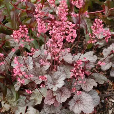 Гейхера "Милан" обладает небольшими округлыми листьями, окрашенными в нежный серебристый цвет с яркими темно-бордовыми прожилками. Обращая внимание на их нижнюю сторону, вы увидите насыщенный темно-красный оттенок, который ближе к осени создаёт удивительный бордовый румянец. Эти уникальные цветовые комбинации делают гейхеру не только декоративным, но и оригинальным элементом вашего ландшафта.