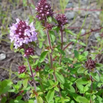 С июня до начала августа Тимьян яйцевидный зацветает — появляются нежные сиренево-розовые цветки, собранные в округлые соцветия на концах побегов. Цветение хоть и не доминирует, но прекрасно подчёркивает структуру растения и добавляет визуального ритма. Аромат — яркий, травянистый, с тонкими камфорными нотами. Он наполняет воздух и делает тимьян не просто растением, а элементом атмосферы.