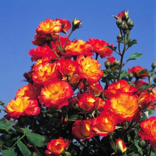 Цветение начинается в июне и продолжается до октября. Бутоны формируются кистями по 5–10 штук, открываются неравномерно, создавая динамичную визуальную массу. Цветки диаметром 5–6 см, густомахровые, с 25–35 лепестками. Оттенок — насыщенный микс оранжевого, малинового, кораллового и абрикосового — меняется в зависимости от фазы цветения и освещения. Каждый цветок уникален. Это даёт кусту живой градиент даже в пределах одного соцветия.